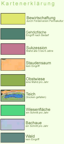 An Hand der farblichen Einteilungen dieser Karte sehen sie die verschiedenen Nutzungsbereiche des Umweltkulturparks und die Intervalle der anfallenden Arbeiten.